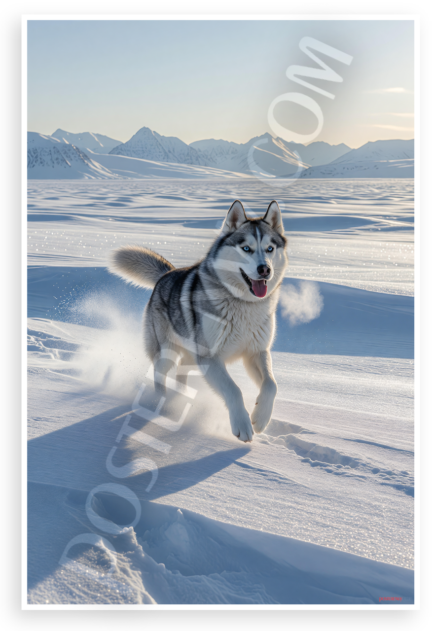 - Arctic Adventure Scene: Vibrant depiction of a fluffy Siberian Husky kicking up snow while running across icy plains with majestic peaks under a pale sky. Energetic mood perfect for living rooms, dens, or pet-themed spaces.