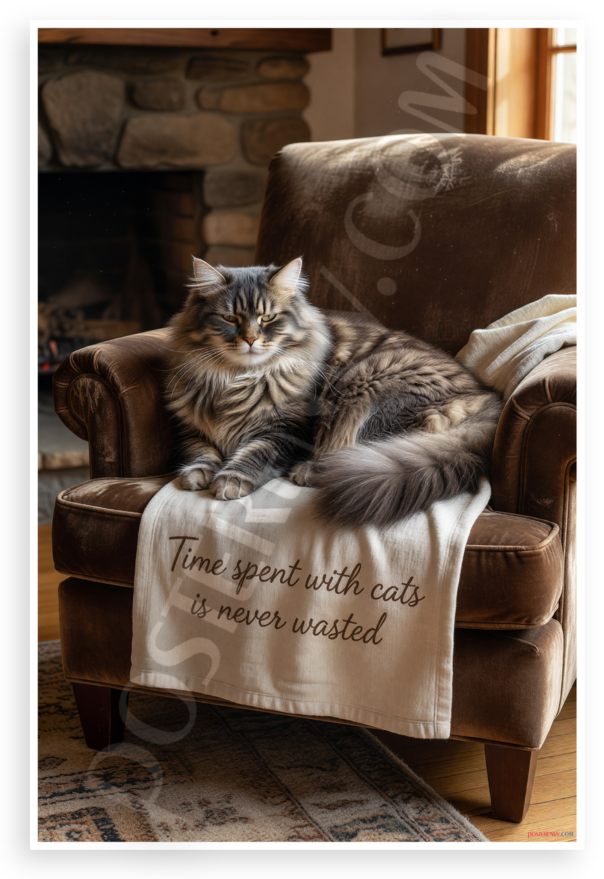 This 12x18 inch poster is printed on premium, durable paper. Proudly Made in the USA by PosterEnvy. The perfect size for any room. PosterEnvy is a family owned business, delivering top-notch posters around the world for over 20 years. Our posters are designed to last — they won't fade or pucker for years of enjoyment. Every poster features crisp, vivid artwork. We are a solar powered company. Featuring Sigmund Freud's quote 'Time spent with cats is never wasted' alongside a majestic Siberian cat lounging on a cozy armchair with a blanket, in a warm fireside room setting. The illustrative style evokes a reflective, comforting mood perfect for cat enthusiasts.