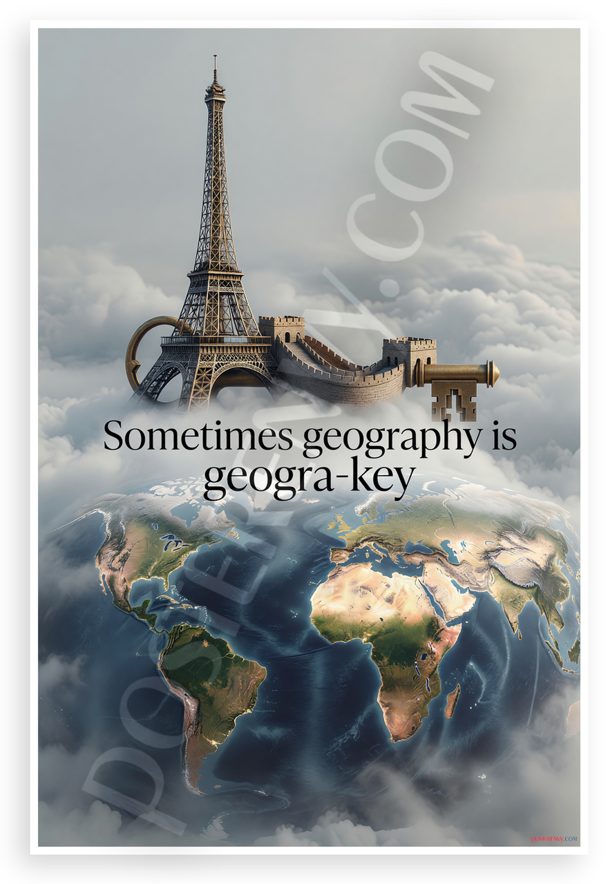 - Creative Geography Pun: Whimsical fusion of Eiffel Tower Great Wall into key shape over global view evokes wonder and humor perfect for classroom study or home office