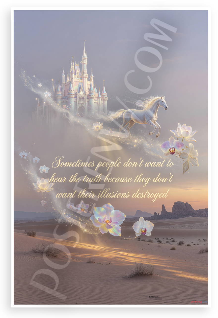 This 12x18 inch poster is printed on premium, durable paper. Proudly Made in the USA by PosterEnvy. The perfect size for any room. PosterEnvy is a family owned business, delivering top-notch posters around the world for over 20 years. Our posters are designed to last — they won't fade or pucker for years of enjoyment. Every poster features crisp, vivid artwork. We are a solar powered company. This ethereal design depicts a floating castle, white horse, and orchids dissolving into a desert landscape, paired with a profound quote on truth and illusions for a serene awakening mood.