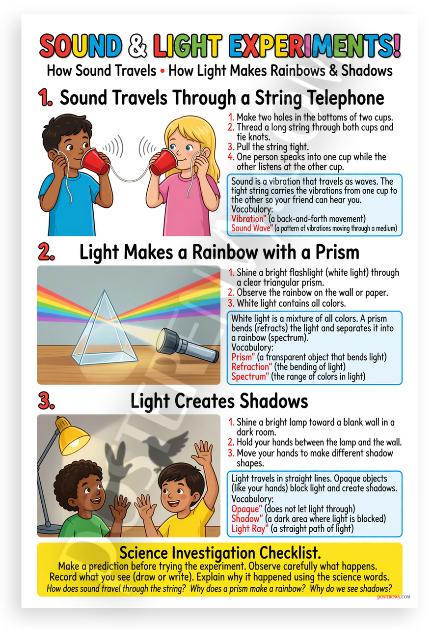 - Premium Print: This PosterEnvy 12x18 inch poster is printed on Durable, Heavy Duty Paper, Designed to last many years. Features sound waves, prism rainbows, shadows, string telephone, experiments for kids