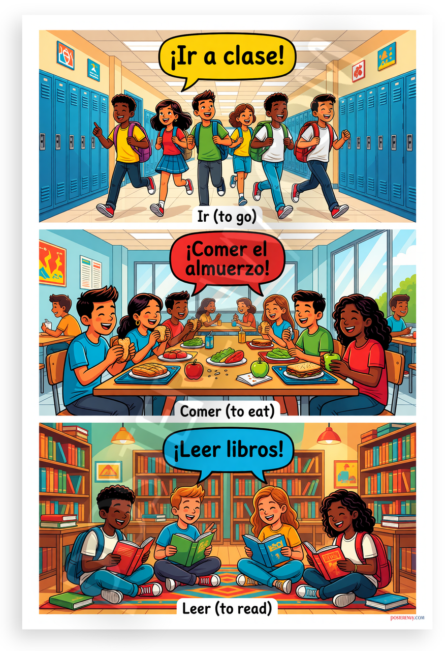 - Premium Print: This PosterEnvy 12x18 inch poster is printed on Durable, Heavy Duty Paper, Designed to last many years. Features Spanish verbs Ir, Comer, Leer with school routines illustrations