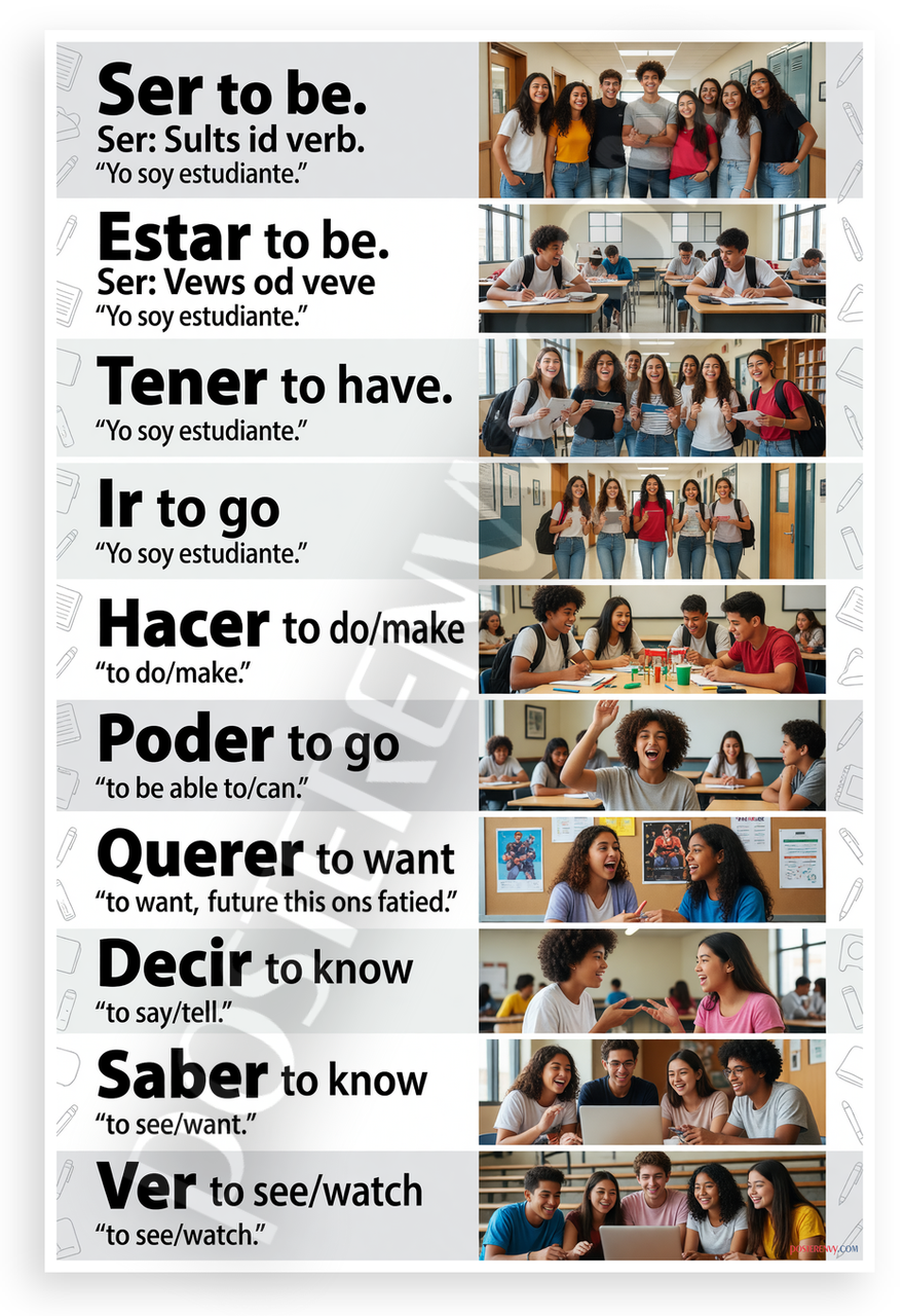 - Classroom Verb Reference: Vibrant images of diverse teens in school settings illustrate each verb like Ser to be, Estar to be, Tener to have. Clean design enhances Spanish speaking and writing skills in middle high school environments