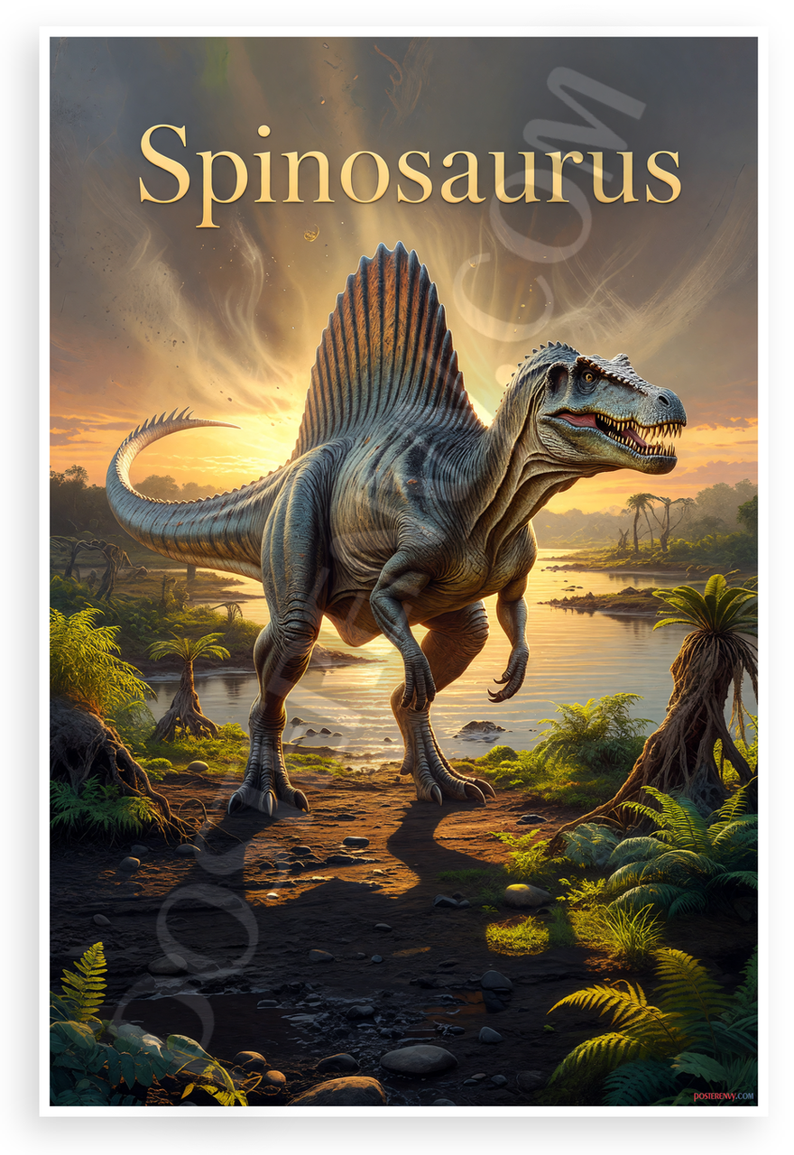 This 12x18 inch poster is printed on premium, durable paper. Proudly Made in the USA by PosterEnvy. The perfect size for any room. PosterEnvy is a family owned business, delivering top-notch posters around the world for over 20 years. Our posters are designed to last — they won't fade or pucker for years of enjoyment. Every poster features crisp, vivid artwork. We are a solar powered company. Featuring a majestic Spinosaurus roaring by a prehistoric river at sunset, with Ernst Stromer's quote on its aquatic discovery. Dramatic golden lighting and lush jungle backdrop create an inspirational prehistoric scene.