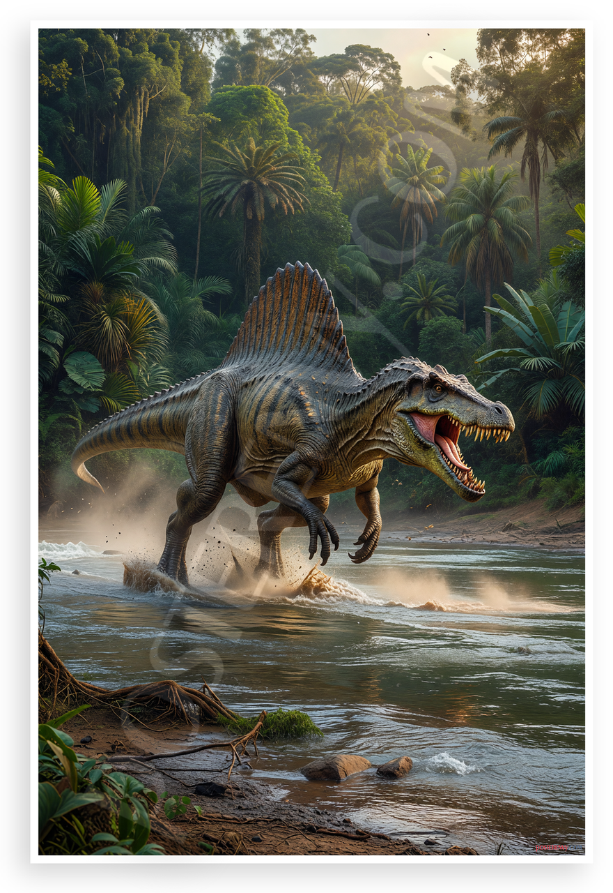 - Solar Powered Production: All our posters are designed and printed using solar energy, with crisp vivid artwork. Showcases realistic Spinosaurus in lush jungle river habitat with golden light
