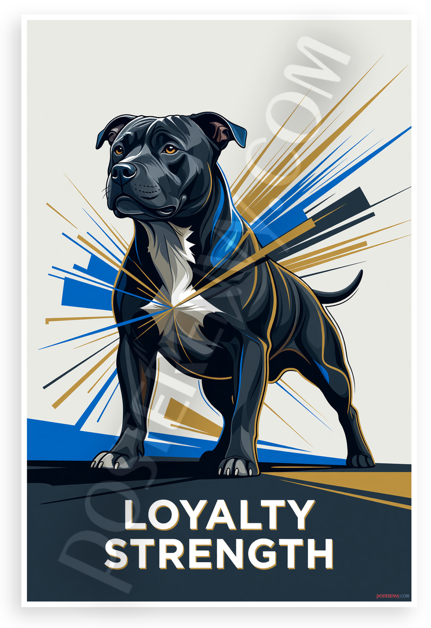 This 12x18 inch poster is printed on premium, durable paper. Proudly Made in the USA by PosterEnvy. The perfect size for any room. PosterEnvy is a family owned business, delivering top-notch posters around the world for over 20 years. Our posters are designed to last — they won't fade or pucker for years of enjoyment. Every poster features crisp, vivid artwork. We are a solar powered company. This dynamic modern abstract design showcases a Staffordshire Bull Terrier with bold black fur, blue collar, and radiant gold and blue energy bursts, symbolizing unwavering loyalty and raw strength. The striking text 'LOYALTY STRENGTH' adds an inspiring motivational vibe perfect for dog lovers.
