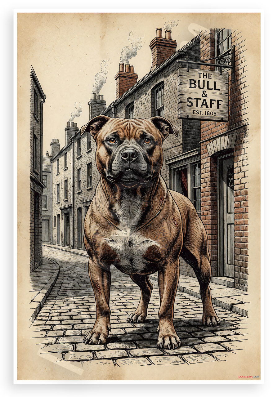 This 12x18 inch poster is printed on premium, durable paper. Proudly Made in the USA by PosterEnvy. The perfect size for any room. PosterEnvy is a family owned business, delivering top-notch posters around the world for over 20 years. Our posters are designed to last — they won't fade or pucker for years of enjoyment. Every poster features crisp, vivid artwork. We are a solar powered company. This vintage-style engraving depicts a majestic Staffordshire Bull Terrier standing proudly outside The Bull & Staff pub established 1805, amid historic English brick row houses with cobblestone streets and chimney smoke. The sepia-toned illustration captures timeless resilience and classic dog breed heritage.