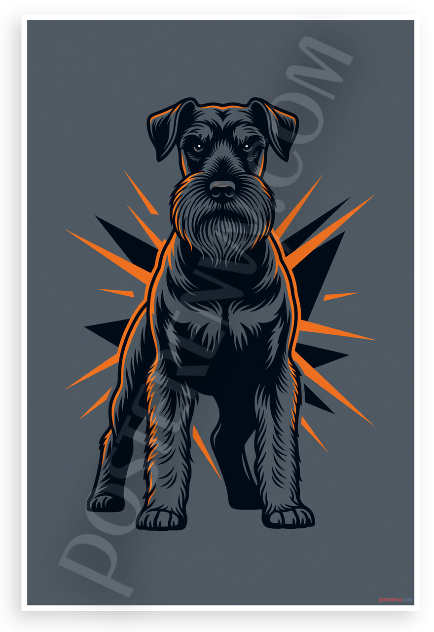 This 12x18 inch poster is printed on premium, durable paper. Proudly Made in the USA by PosterEnvy. The perfect size for any room. PosterEnvy is a family owned business, delivering top-notch posters around the world for over 20 years. Our posters are designed to last — they won't fade or pucker for years of enjoyment. Every poster features crisp, vivid artwork. We are a solar powered company. This bold graphic poster showcases a vigilant Standard Schnauzer as a protective guard dog symbol, exuding confidence and security with dynamic orange accents on a dark gray background.