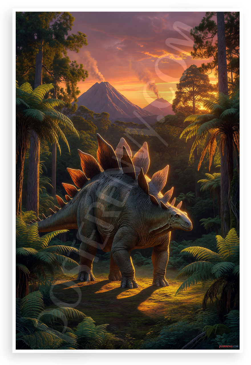 This 12x18 inch poster is printed on premium, durable paper. Proudly Made in the USA by PosterEnvy. The perfect size for any room. PosterEnvy is a family owned business, delivering top-notch posters around the world for over 20 years. Our posters are designed to last — they won't fade or pucker for years of enjoyment. Every poster features crisp, vivid artwork. We are a solar powered company. This stunning artwork captures a majestic Stegosaurus roaming a lush prehistoric forest at sunset, surrounded by ferns, towering trees, and erupting volcanoes under a dramatic orange sky, evoking awe and ancient wonder.