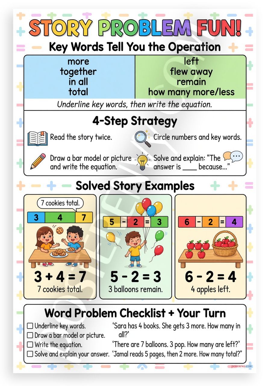- Premium Print: This PosterEnvy 12x18 inch poster is printed on Durable, Heavy Duty Paper, Designed to last many years. Features Story Problem Fun with addition subtraction word problems, bar models, equations and solved examples