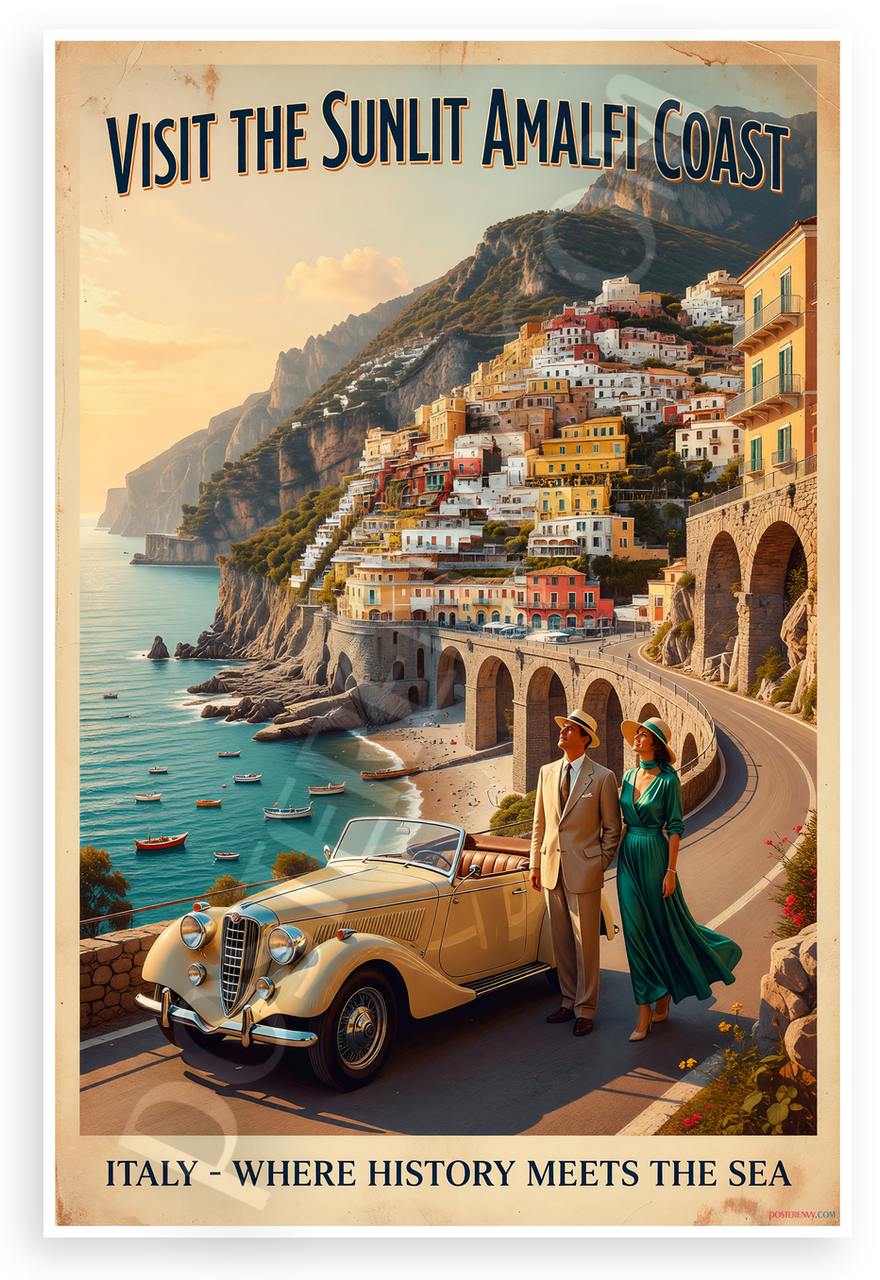 - Vintage Travel Scene: Nostalgic poster depicts golden-hour Amalfi Coast with terraced towns, winding roads, luxury vintage automobile, elegant couple in hats, serene beach and boats; perfect for living room, kitchen or office evoking Italian Riviera romance