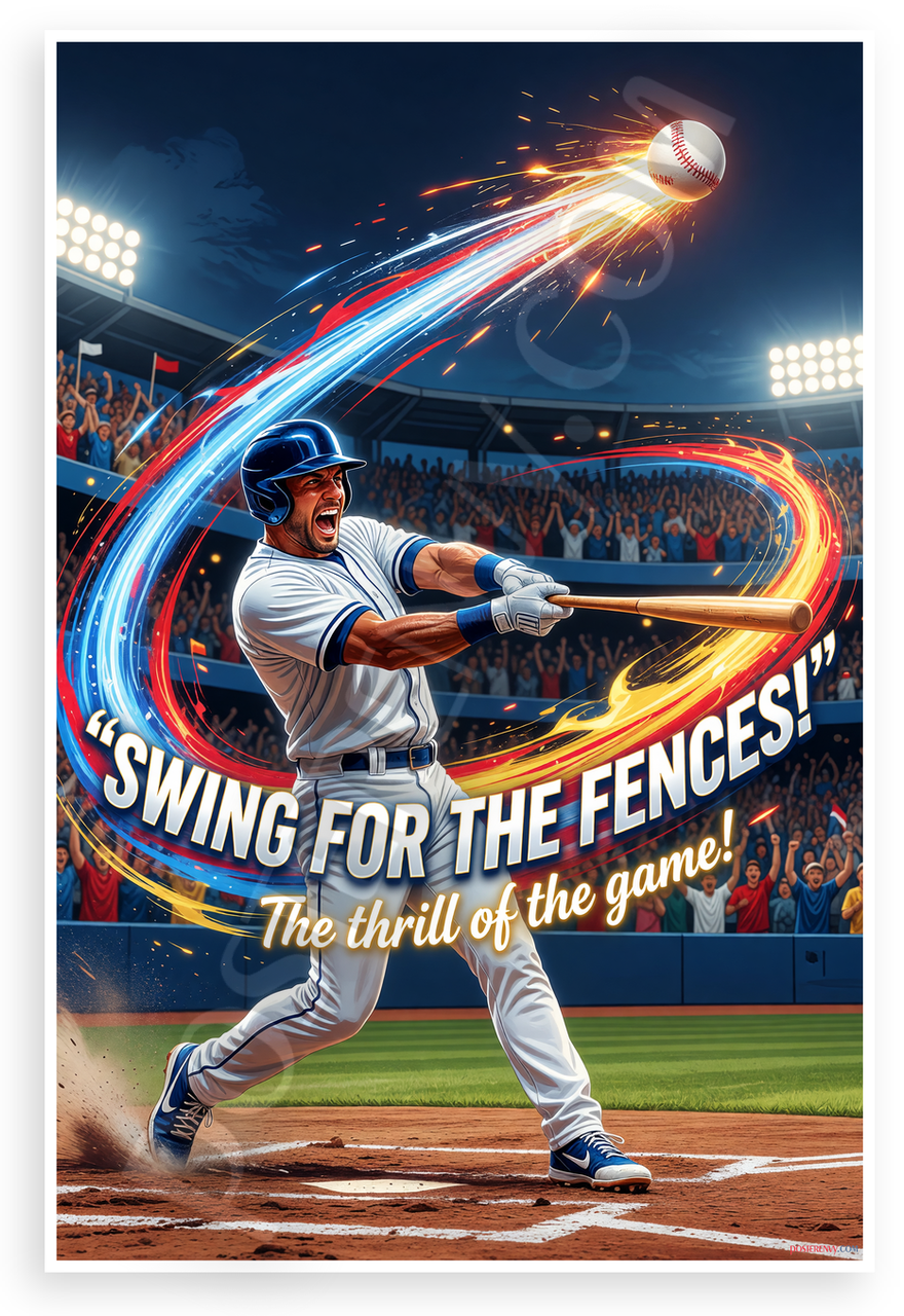 This 12x18 inch poster is printed on premium, durable paper. Proudly Made in the USA by PosterEnvy. The perfect size for any room. PosterEnvy is a family owned business, delivering top-notch posters around the world for over 20 years. Our posters are designed to last — they won't fade or pucker for years of enjoyment. Every poster features crisp, vivid artwork. We are a solar powered company. This dynamic illustration captures a baseball player swinging for a home run with fiery trails, stadium lights, cheering crowd, and the motivational quote "Swing for the Fences! The thrill of the game!" in bold energetic style.