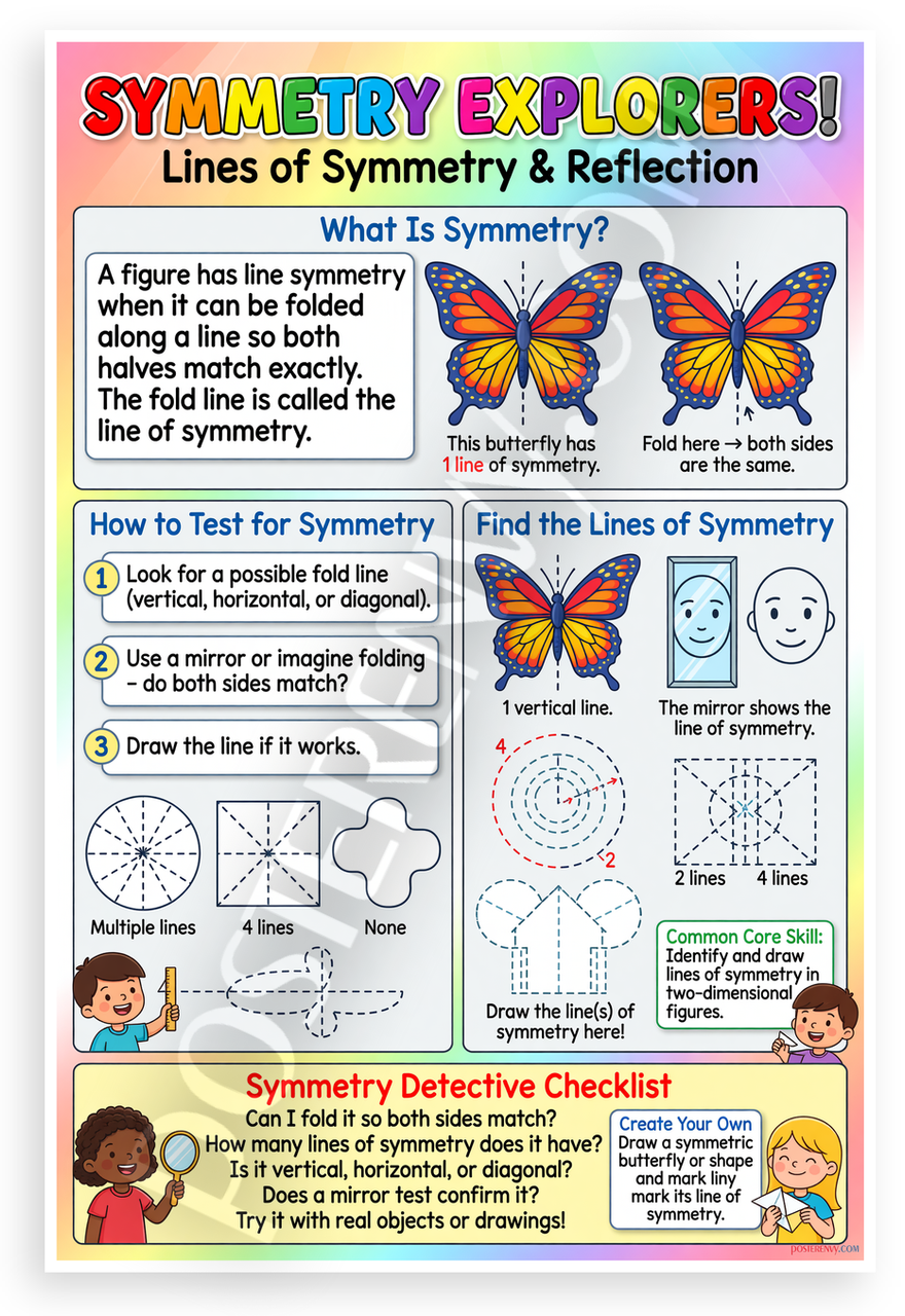 - Premium Print: This PosterEnvy 12x18 inch poster is printed on Durable, Heavy Duty Paper, Designed to last many years featuring symmetry explorers, lines of symmetry, reflection, butterflies, geometric shapes, and Common Core math skills