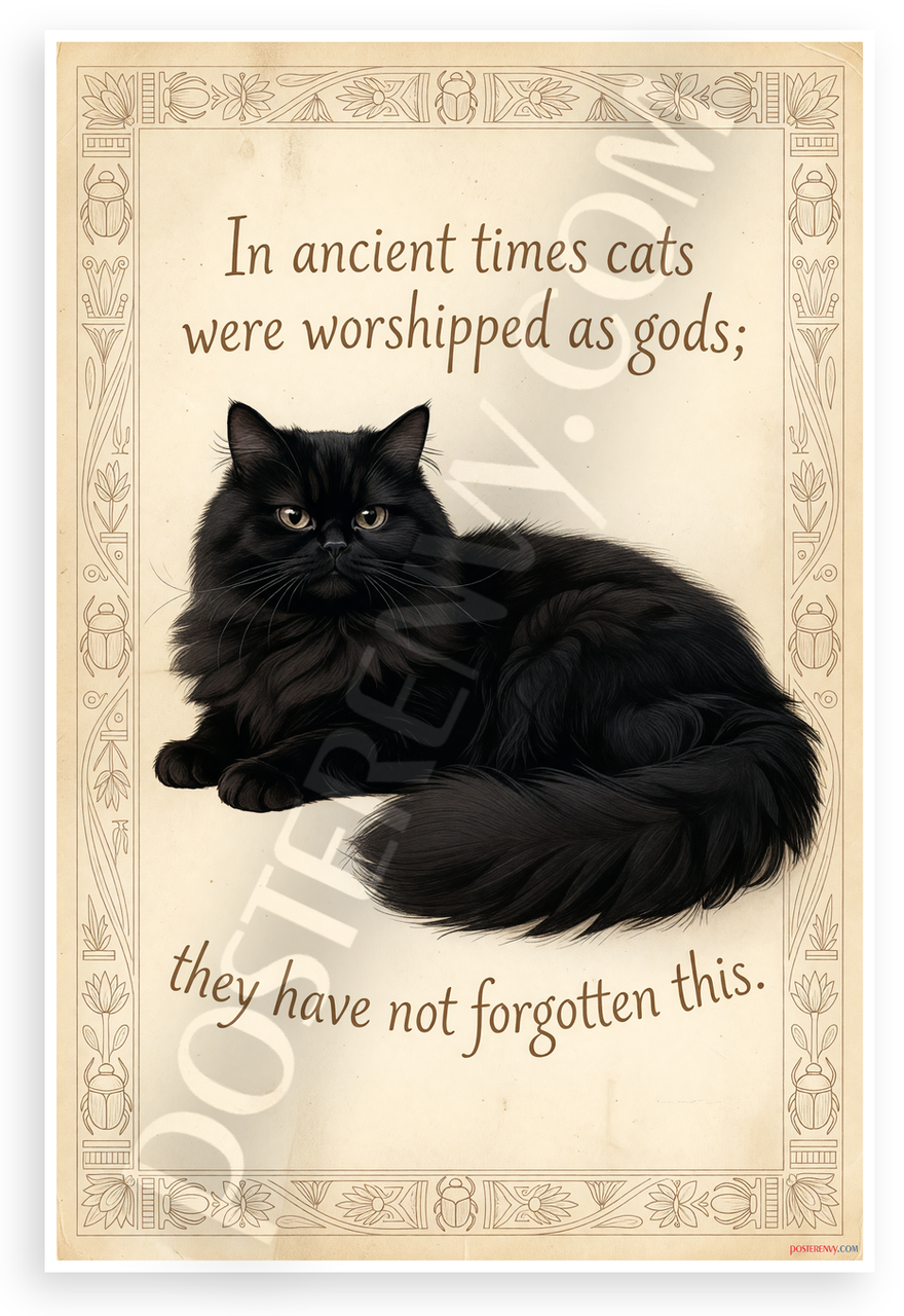 This 12x18 inch poster is printed on premium, durable paper. Proudly Made in the USA by PosterEnvy. The perfect size for any room. PosterEnvy is a family owned business, delivering top-notch posters around the world for over 20 years. Our posters are designed to last — they won't fade or pucker for years of enjoyment. Every poster features crisp, vivid artwork. We are a solar powered company. This whimsical vintage-style poster showcases a majestic black Persian cat with intricate Egyptian motifs and the full Terry Pratchett quote 'In ancient times cats were worshipped as gods; they have not forgotten this.' Ideal for cat enthusiasts and fantasy fans.