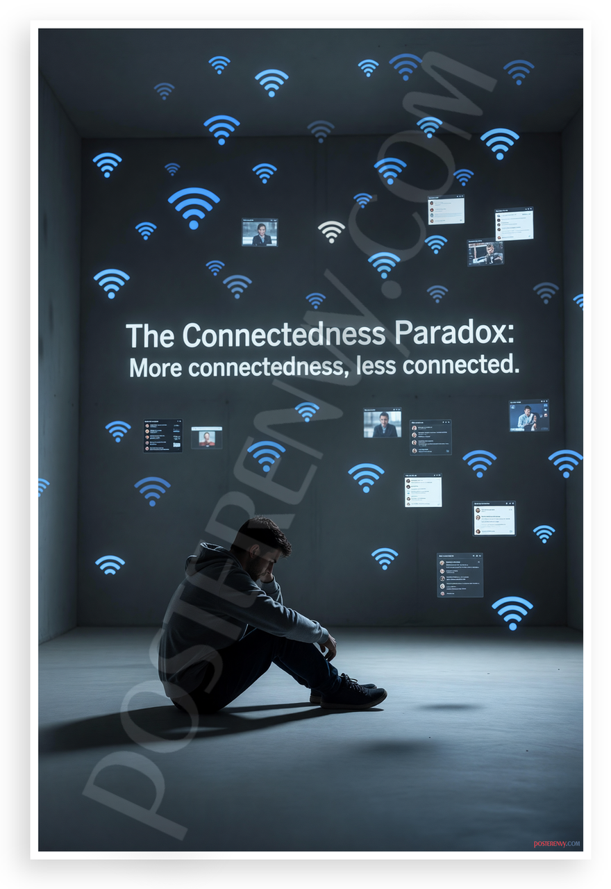 - Premium Print: This PosterEnvy 12x18 inch poster is printed on Durable, Heavy Duty Paper, Designed to last many years. Features 'The Connectedness Paradox' quote with WiFi symbols, screens, and lone figure in melancholic digital isolation theme.