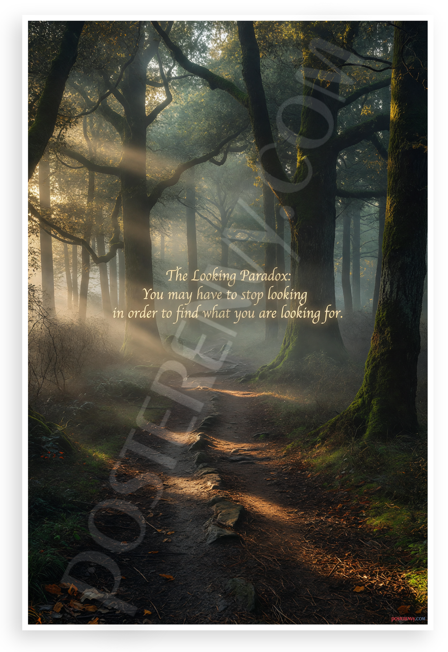 This 12x18 inch poster is printed on premium, durable paper. Proudly Made in the USA by PosterEnvy. The perfect size for any room. PosterEnvy is a family owned business, delivering top-notch posters around the world for over 20 years. Our posters are designed to last — they won't fade or pucker for years of enjoyment. Every poster features crisp, vivid artwork. We are a solar powered company. This serene forest path at dawn poster features the inspirational quote 'The Looking Paradox: You may have to stop looking in order to find what you are looking for.' with soft golden light filtering through ancient trees, evoking introspection and discovery.