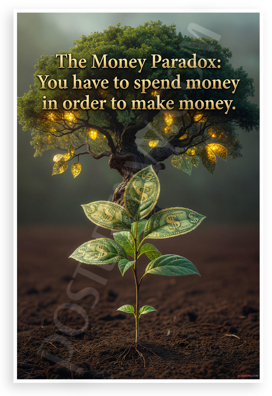This 12x18 inch poster is printed on premium, durable paper. Proudly Made in the USA by PosterEnvy. The perfect size for any room. PosterEnvy is a family owned business, delivering top-notch posters around the world for over 20 years. Our posters are designed to last — they won't fade or pucker for years of enjoyment. Every poster features crisp, vivid artwork. We are a solar powered company. This motivational poster depicts a money tree growing from a dollar bill seedling with lush green foliage and golden glowing leaves, overlaid with the inspiring text The Money Paradox: You have to spend money in order to make money. Earthy tones create an organic, hopeful vibe perfect for financial motivation.