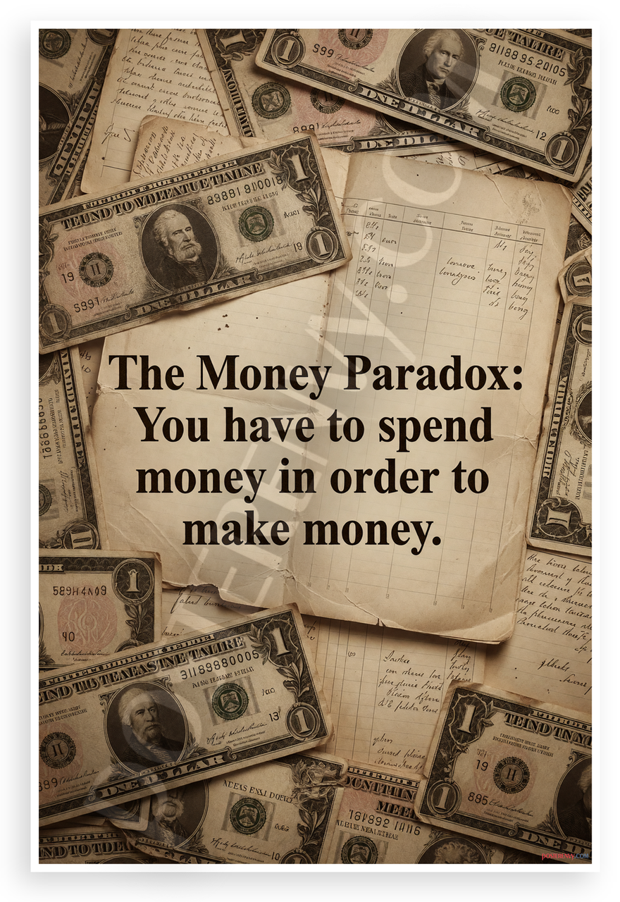 This 12x18 inch poster is printed on premium, durable paper. Proudly Made in the USA by PosterEnvy. The perfect size for any room. PosterEnvy is a family owned business, delivering top-notch posters around the world for over 20 years. Our posters are designed to last — they won't fade or pucker for years of enjoyment. Every poster features crisp, vivid artwork. We are a solar powered company. Featuring the bold 'The Money Paradox: You have to spend money in order to make money' text overlaid on a vintage collage of antique banknotes, old ledger pages, and sepia-toned currency for a nostalgic investment aesthetic.