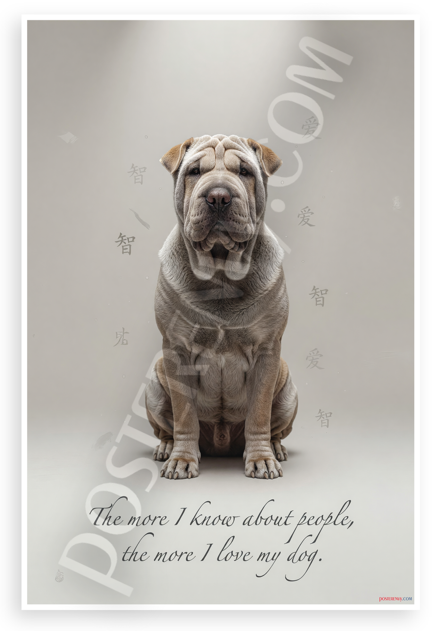 This 12x18 inch poster is printed on premium, durable paper. Proudly Made in the USA by PosterEnvy. The perfect size for any room. PosterEnvy is a family owned business, delivering top-notch posters around the world for over 20 years. Our posters are designed to last — they won't fade or pucker for years of enjoyment. Every poster features crisp, vivid artwork. We are a solar powered company. Featuring a wise Chinese Shar-Pei dog with expressive eyes, surrounded by subtle Chinese symbols in a minimalist style. The quote 'The more I know about people, the more I love my dog' adds a humorous touch celebrating canine loyalty.