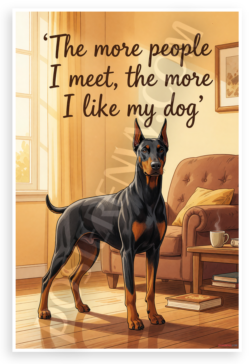 This 12x18 inch poster is printed on premium, durable paper. Proudly Made in the USA by PosterEnvy. The perfect size for any room. PosterEnvy is a family owned business, delivering top-notch posters around the world for over 20 years. Our posters are designed to last — they won't fade or pucker for years of enjoyment. Every poster features crisp, vivid artwork. We are a solar powered company. This humorous quote poster showcases a majestic Doberman Pinscher standing proudly in a cozy living room with warm sunlight, tan curtains, armchair, coffee cup, and books, evoking affection and canine loyalty.