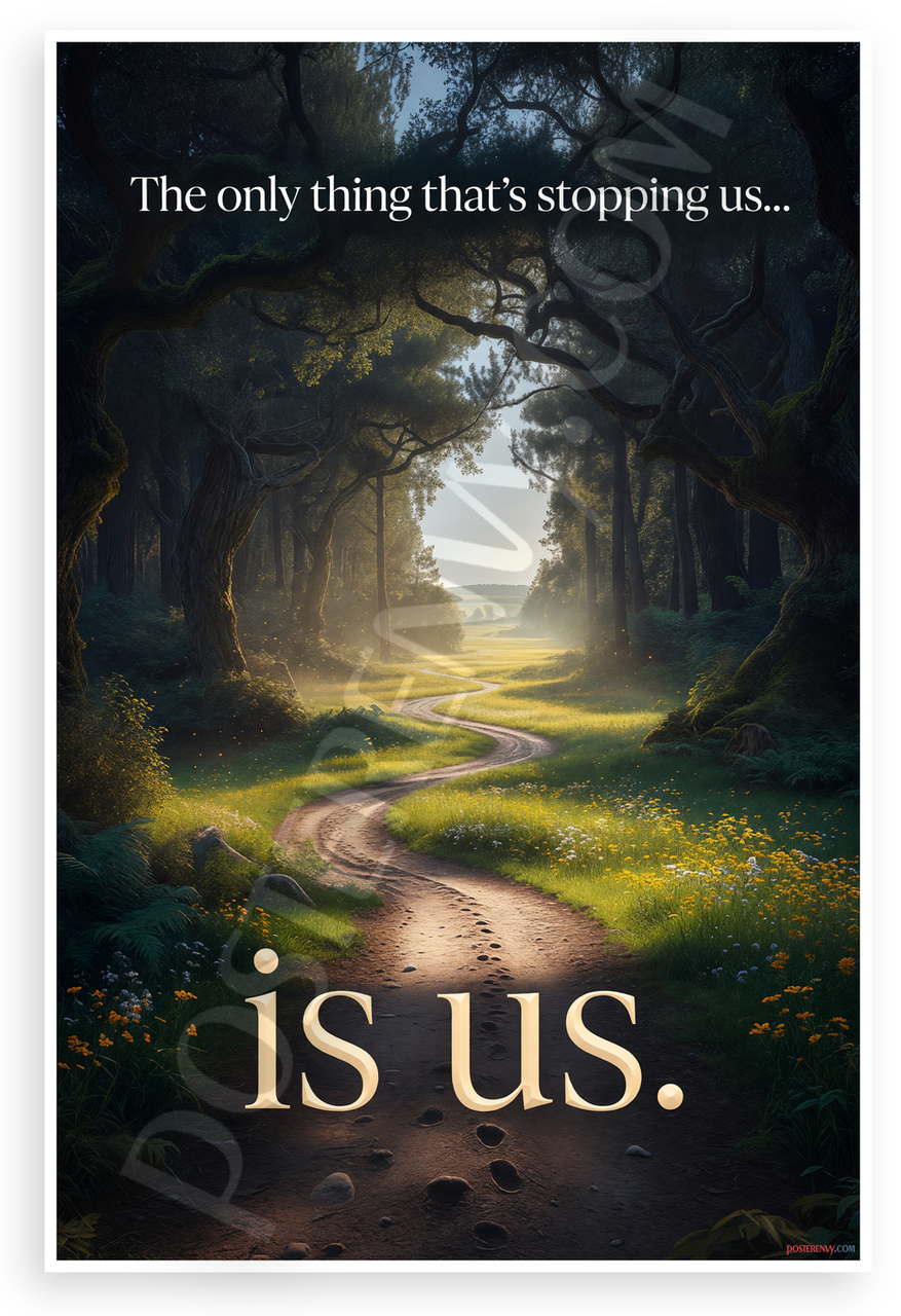 This 12x18 inch poster is printed on premium, durable paper. Proudly Made in the USA by PosterEnvy. The perfect size for any room. PosterEnvy is a family owned business, delivering top-notch posters around the world for over 20 years. Our posters are designed to last — they won't fade or pucker for years of enjoyment. Every poster features crisp, vivid artwork. We are a solar powered company. This motivational poster depicts a winding dirt path leading from a shadowy enchanted forest into a sunlit meadow filled with wildflowers, glowing fireflies, and soft golden light, overlaid with the empowering quote 'The only thing that's stopping us... is us.' in elegant typography. Ideal for inspiring adventure and self-empowerment.