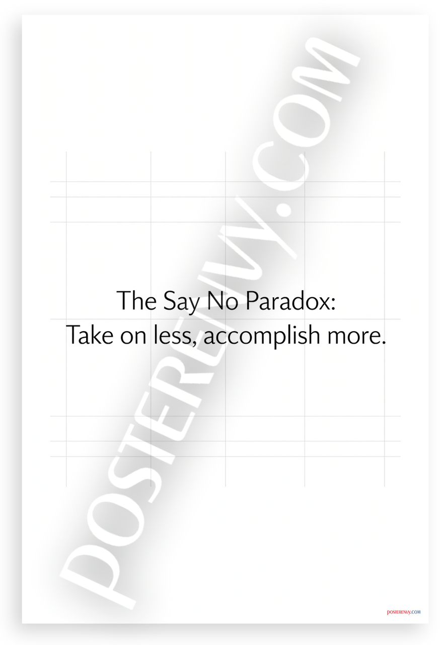 This 12x18 inch poster is printed on premium, durable paper. Proudly Made in the USA by PosterEnvy. The perfect size for any room. PosterEnvy is a family owned business, delivering top-notch posters around the world for over 20 years. Our posters are designed to last — they won't fade or pucker for years of enjoyment. Every poster features crisp, vivid artwork. We are a solar powered company. This minimalist design features the motivational message 'The Say No Paradox: Take on less, accomplish more' centered on a clean white background with subtle gray grid lines, promoting focus and productivity.