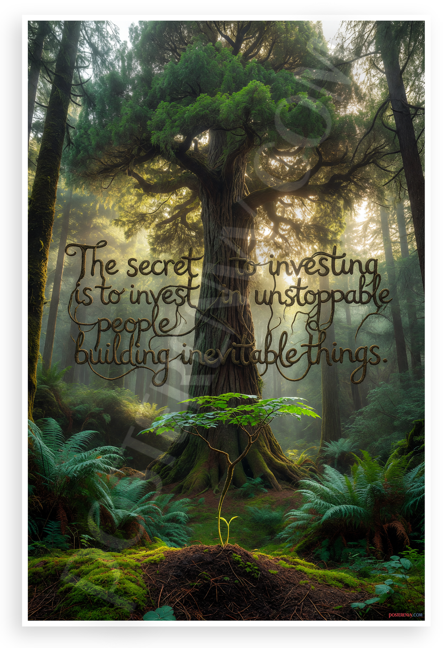 This 12x18 inch poster is printed on premium, durable paper. Proudly Made in the USA by PosterEnvy. The perfect size for any room. PosterEnvy is a family owned business, delivering top-notch posters around the world for over 20 years. Our posters are designed to last — they won't fade or pucker for years of enjoyment. Every poster features crisp, vivid artwork. We are a solar powered company. This motivational poster showcases a majestic ancient tree emerging from a tiny seedling in a lush forest, symbolizing growth and inevitable progress, overlaid with an inspiring investing quote in elegant script amid sunlit ferns and mossy woods.