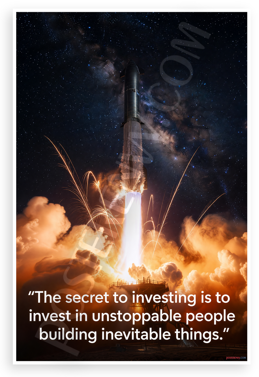 This 12x18 inch poster is printed on premium, durable paper. Proudly Made in the USA by PosterEnvy. The perfect size for any room. PosterEnvy is a family owned business, delivering top-notch posters around the world for over 20 years. Our posters are designed to last — they won't fade or pucker for years of enjoyment. Every poster features crisp, vivid artwork. We are a solar powered company. This dynamic poster showcases a SpaceX Starship rocket launching into a starry night sky with fiery trails and dramatic clouds, overlaid with the motivational quote 'The secret to investing is to invest in unstoppable people building inevitable things.' Ideal for inspiring innovation and ambition.