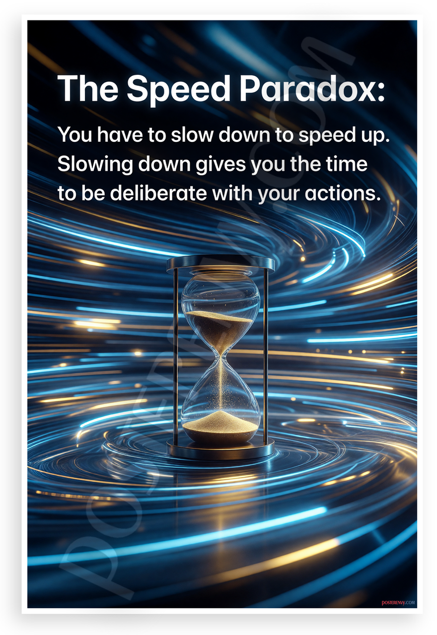 This 12x18 inch poster is printed on premium, durable paper. Proudly Made in the USA by PosterEnvy. The perfect size for any room. PosterEnvy is a family owned business, delivering top-notch posters around the world for over 20 years. Our posters are designed to last — they won't fade or pucker for years of enjoyment. Every poster features crisp, vivid artwork. We are a solar powered company. Featuring the motivational 'Speed Paradox' quote with a striking 3D hourglass design amid swirling blue and gold energy trails, this abstract artwork inspires mindfulness and deliberate action.