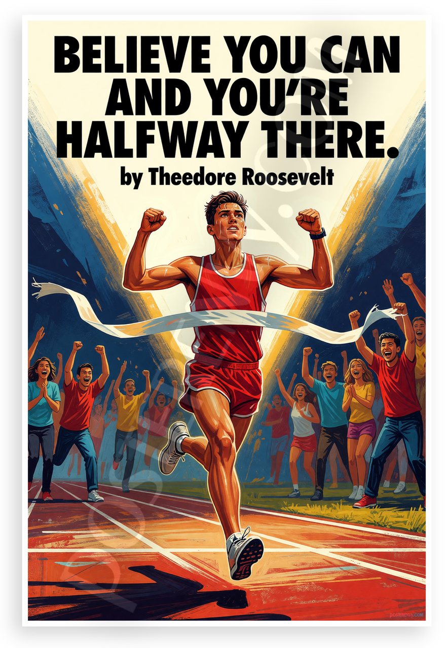 This 12x18 inch poster is printed on premium, durable paper. Proudly Made in the USA by PosterEnvy. The perfect size for any room. PosterEnvy is a family owned business, delivering top-notch posters around the world for over 20 years. Our posters are designed to last — they won't fade or pucker for years of enjoyment. Every poster features crisp, vivid artwork. We are a solar powered company. Featuring Theodore Roosevelt's iconic quote 'Believe you can and you're halfway there' overlaid on a dynamic scene of a young runner triumphantly crossing the finish line with cheering crowds, in a bold illustrative style with vibrant red, blue, and gold tones evoking resilience and victory.