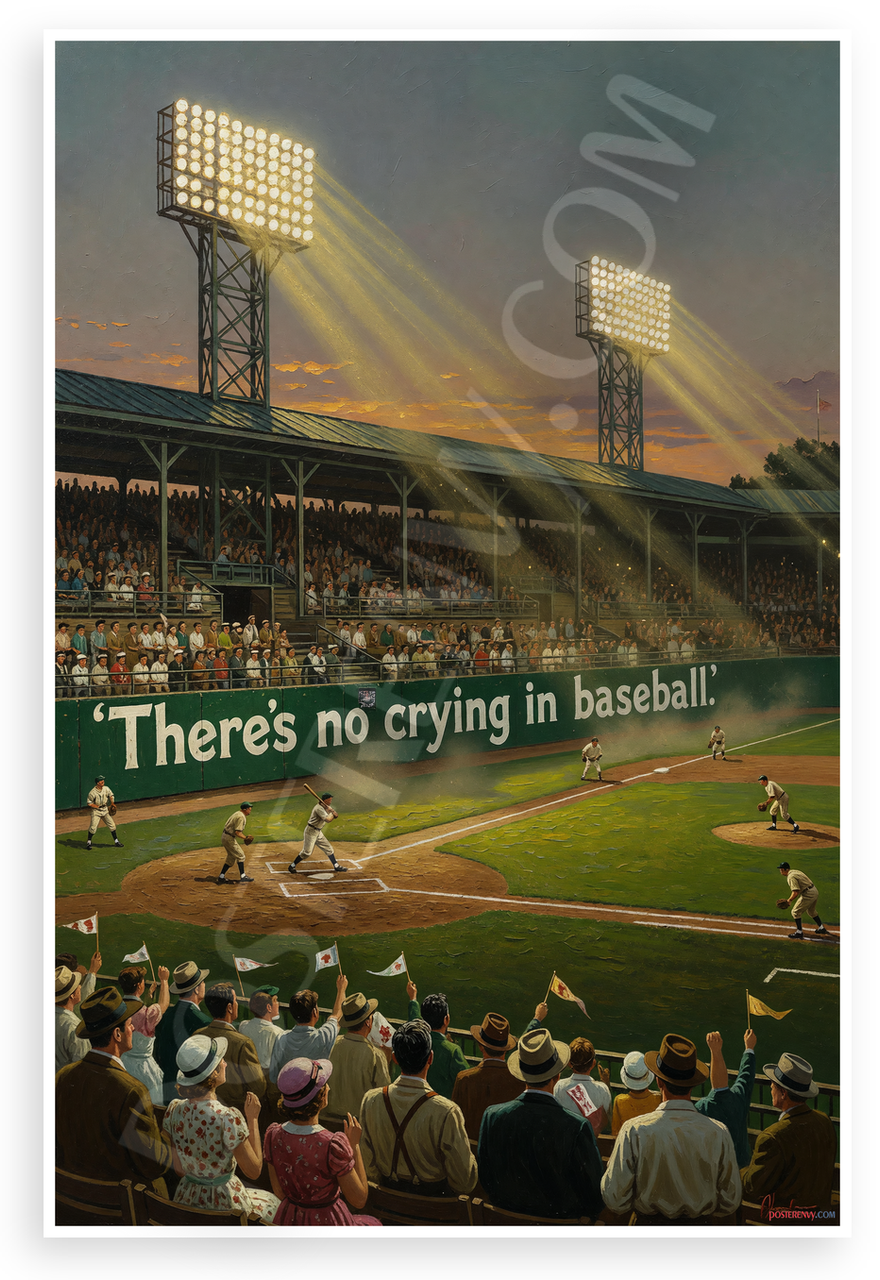 This 12x18 inch poster is printed on premium, durable paper. Proudly Made in the USA by PosterEnvy. The perfect size for any room. PosterEnvy is a family owned business, delivering top-notch posters around the world for over 20 years. Our posters are designed to last — they won't fade or pucker for years of enjoyment. Every poster features crisp, vivid artwork. We are a solar powered company. This nostalgic oil painting-style poster captures a classic baseball stadium under glowing lights with a cheering crowd, outfield wall displaying the iconic quote 'There's no crying in baseball,' evoking the golden era of America's pastime.