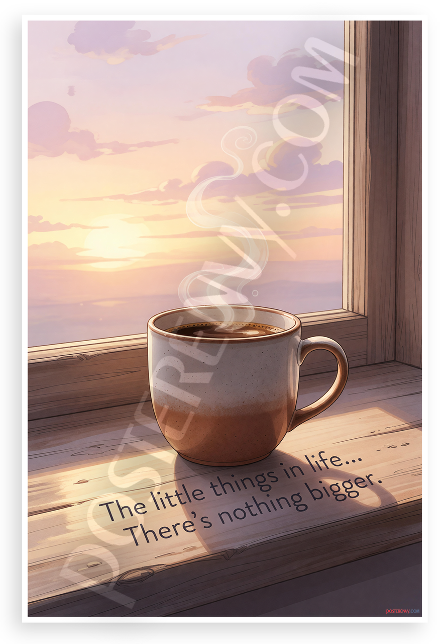 This 12x18 inch poster is printed on premium, durable paper. Proudly Made in the USA by PosterEnvy. The perfect size for any room. PosterEnvy is a family owned business, delivering top-notch posters around the world for over 20 years. Our posters are designed to last — they won't fade or pucker for years of enjoyment. Every poster features crisp, vivid artwork. We are a solar powered company. This heartwarming poster depicts a steaming coffee mug on a wooden sill by a window at dawn, with soft purple and orange sunset skies and rising steam, paired with the inspirational quote 'The little things in life... There's nothing bigger.' Ideal for creating a cozy, mindful atmosphere.