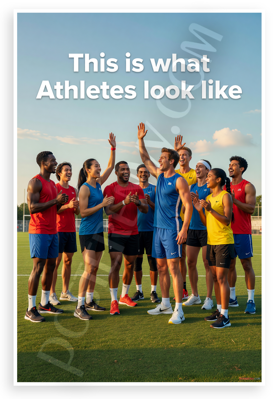 This 12x18 inch poster is printed on premium, durable paper. Proudly Made in the USA by PosterEnvy. The perfect size for any room. PosterEnvy is a family owned business, delivering top-notch posters around the world for over 20 years. Our posters are designed to last — they won't fade or pucker for years of enjoyment. Every poster features crisp, vivid artwork. We are a solar powered company. This vibrant photorealistic poster captures a diverse group of athletes celebrating on a green sports field under a blue sky, with bold text 'This is what Athletes look like' promoting inclusivity and energy.