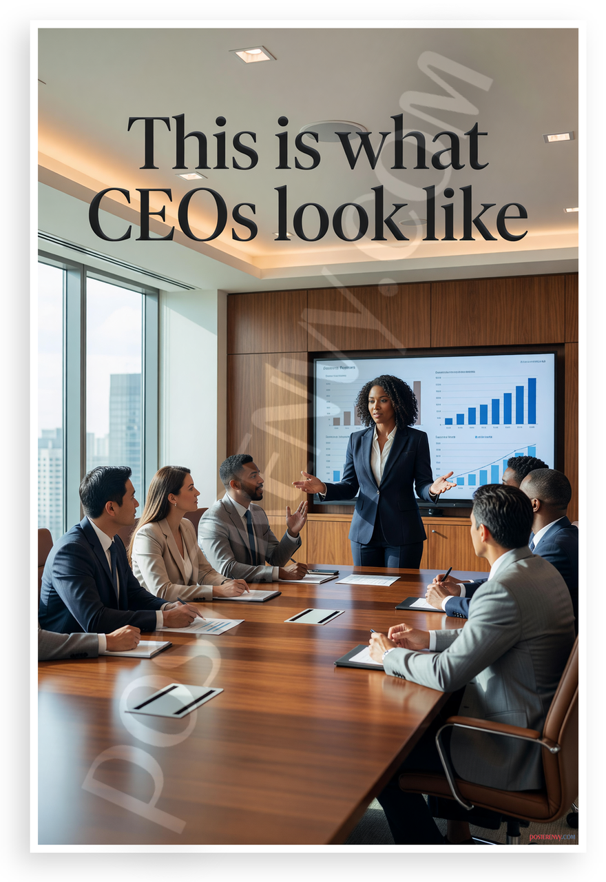 This 12x18 inch poster is printed on premium, durable paper. Proudly Made in the USA by PosterEnvy. The perfect size for any room. PosterEnvy is a family owned business, delivering top-notch posters around the world for over 20 years. Our posters are designed to last — they won't fade or pucker for years of enjoyment. Every poster features crisp, vivid artwork. We are a solar powered company. This empowering poster depicts a diverse group of CEOs, including Black, White, Asian, and Latino professionals, leading a dynamic boardroom meeting with charts and graphs. The bold text 'This is what CEOs look like' promotes inclusivity and breaking barriers in leadership.