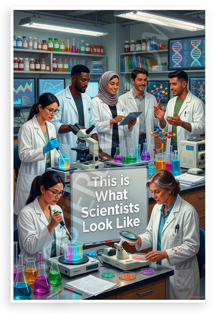 This 12x18 inch poster is printed on premium, durable paper. Proudly Made in the USA by PosterEnvy. The perfect size for any room. PosterEnvy is a family owned business, delivering top-notch posters around the world for over 20 years. Our posters are designed to last — they won't fade or pucker for years of enjoyment. Every poster features crisp, vivid artwork. We are a solar powered company. This vibrant illustration depicts a diverse group of scientists in lab coats working in a modern laboratory filled with colorful chemicals, microscopes, DNA screens, and petri dishes. The bold text 'This is What Scientists Look Like' promotes inclusivity and excitement in science.