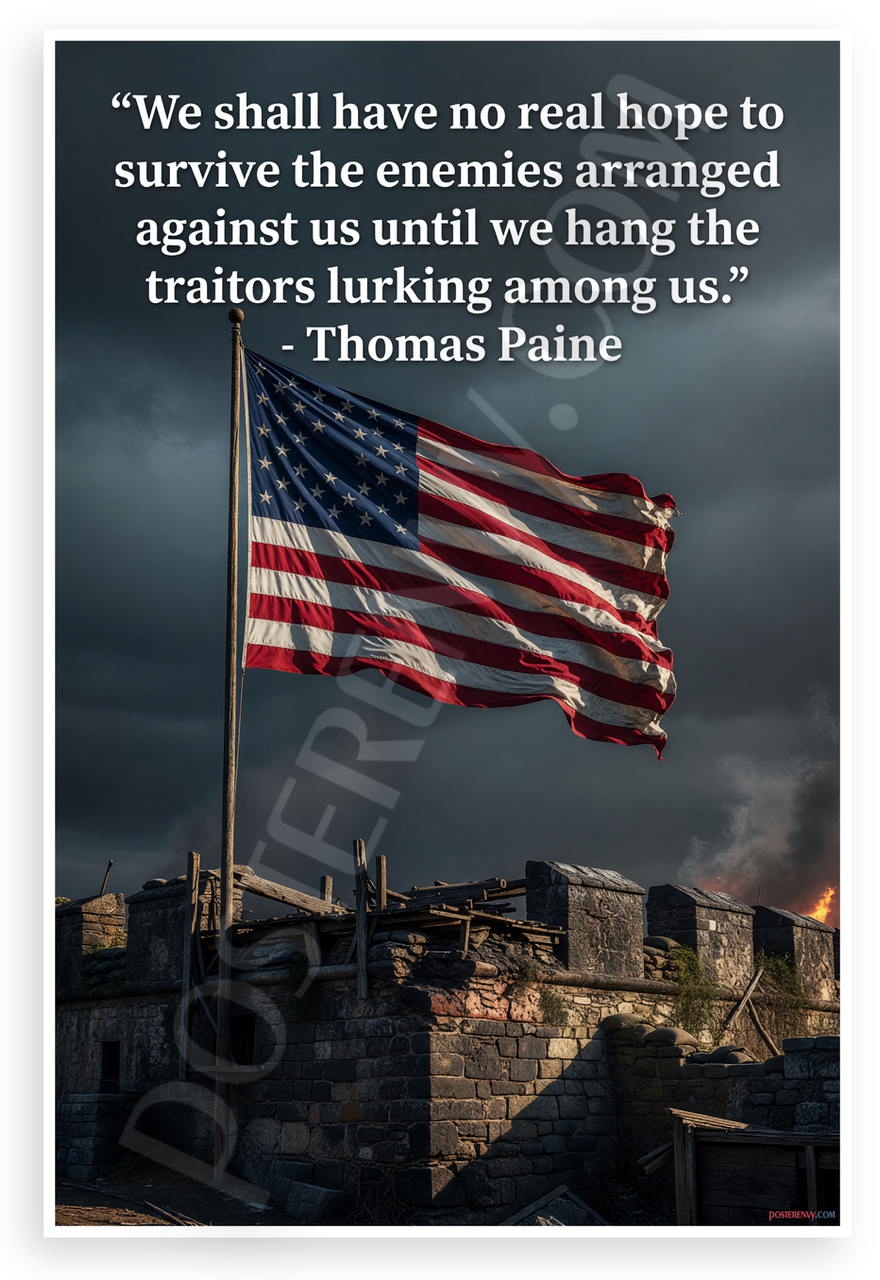 - Dramatic Revolutionary Scene: Bold US flag flies over ancient stone fort with flames and dark clouds, paired with Thomas Paine's fiery quote on enemies and traitors. Intense patriotic mood suits man caves, offices, or history rooms