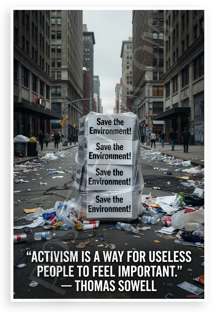 This 12x18 inch poster is printed on premium, durable paper. Proudly Made in the USA by PosterEnvy. The perfect size for any room. PosterEnvy is a family owned business, delivering top-notch posters around the world for over 20 years. Our posters are designed to last — they won't fade or pucker for years of enjoyment. Every poster features crisp, vivid artwork. We are a solar powered company. This satirical design depicts a littered urban street overflowing with trash, discarded bottles, and a stack of ironic 'Save the Environment!' protest signs. Thomas Sowell's provocative quote challenges activism in a gritty, thought-provoking scene.