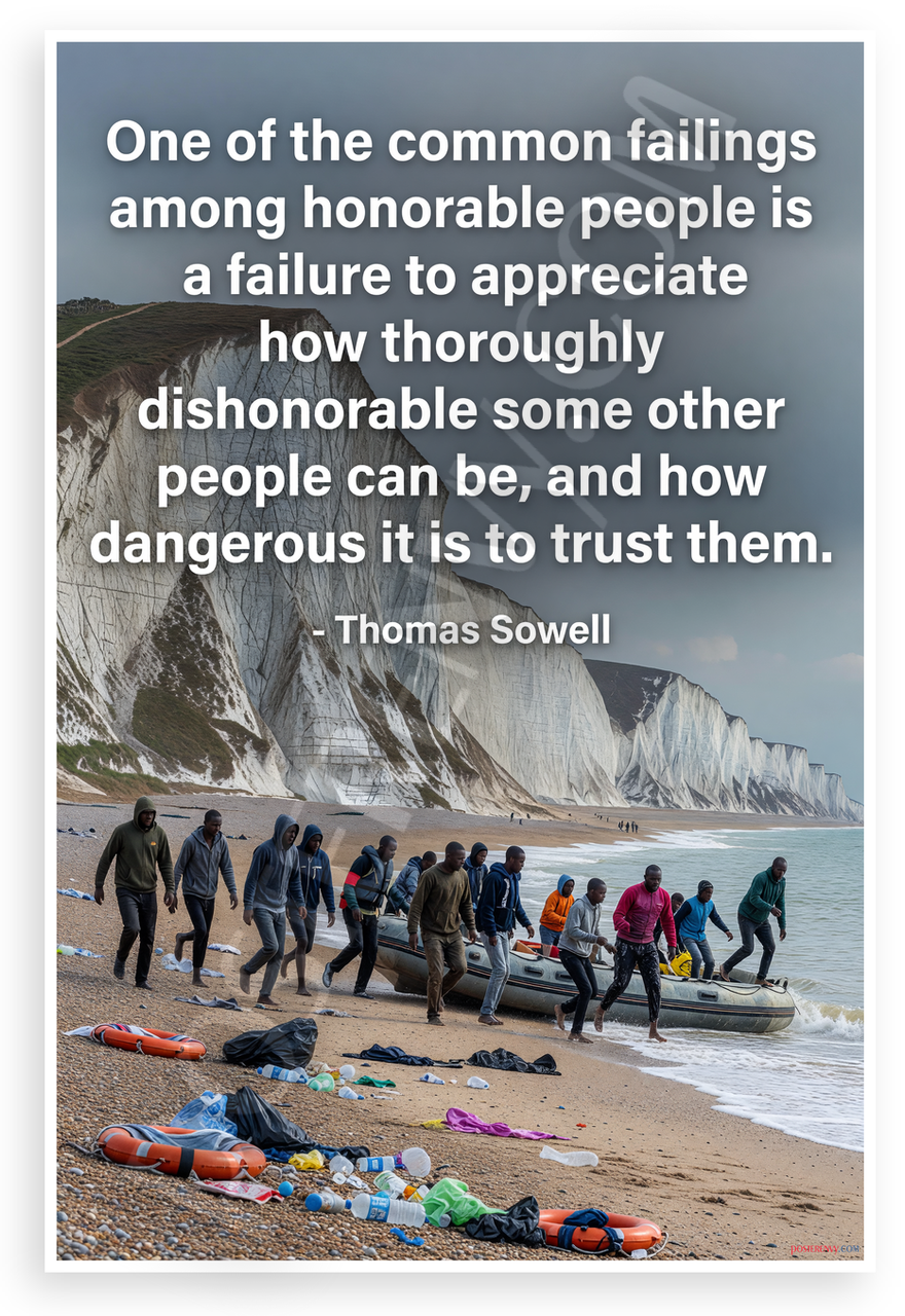 - Provocative Quote Scene: Thomas Sowell quote on honorable vs dishonorable people overlays migrants disembarking boat on beach amid trash near towering white cliffs, creating tense cautionary mood. Ideal for office, study, or library.