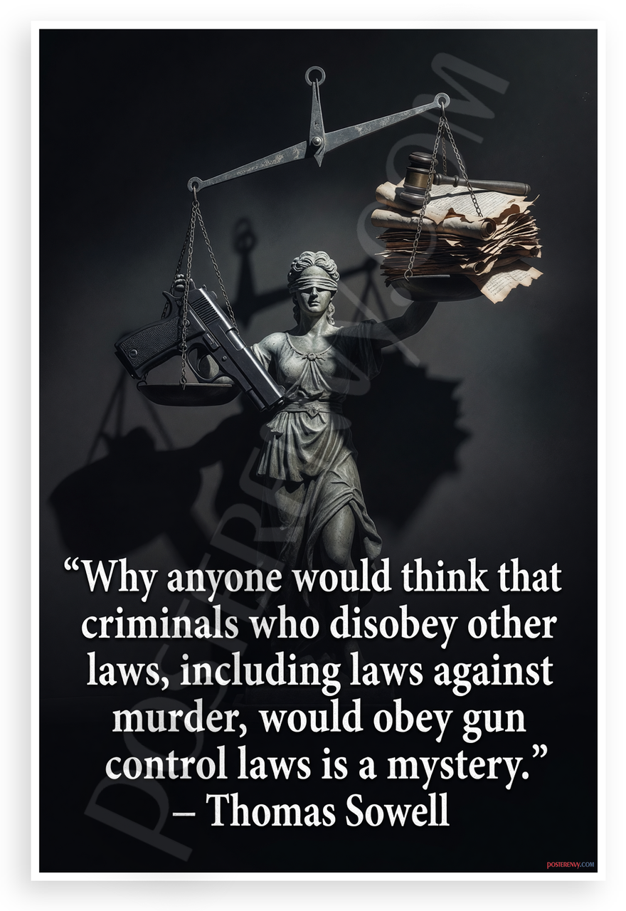 - Premium Print: This PosterEnvy 12x18 inch poster is printed on Durable, Heavy Duty Paper, Designed to last many years. Features Thomas Sowell gun control quote with Lady Justice scales, gun, and legal documents in moody grayscale style.