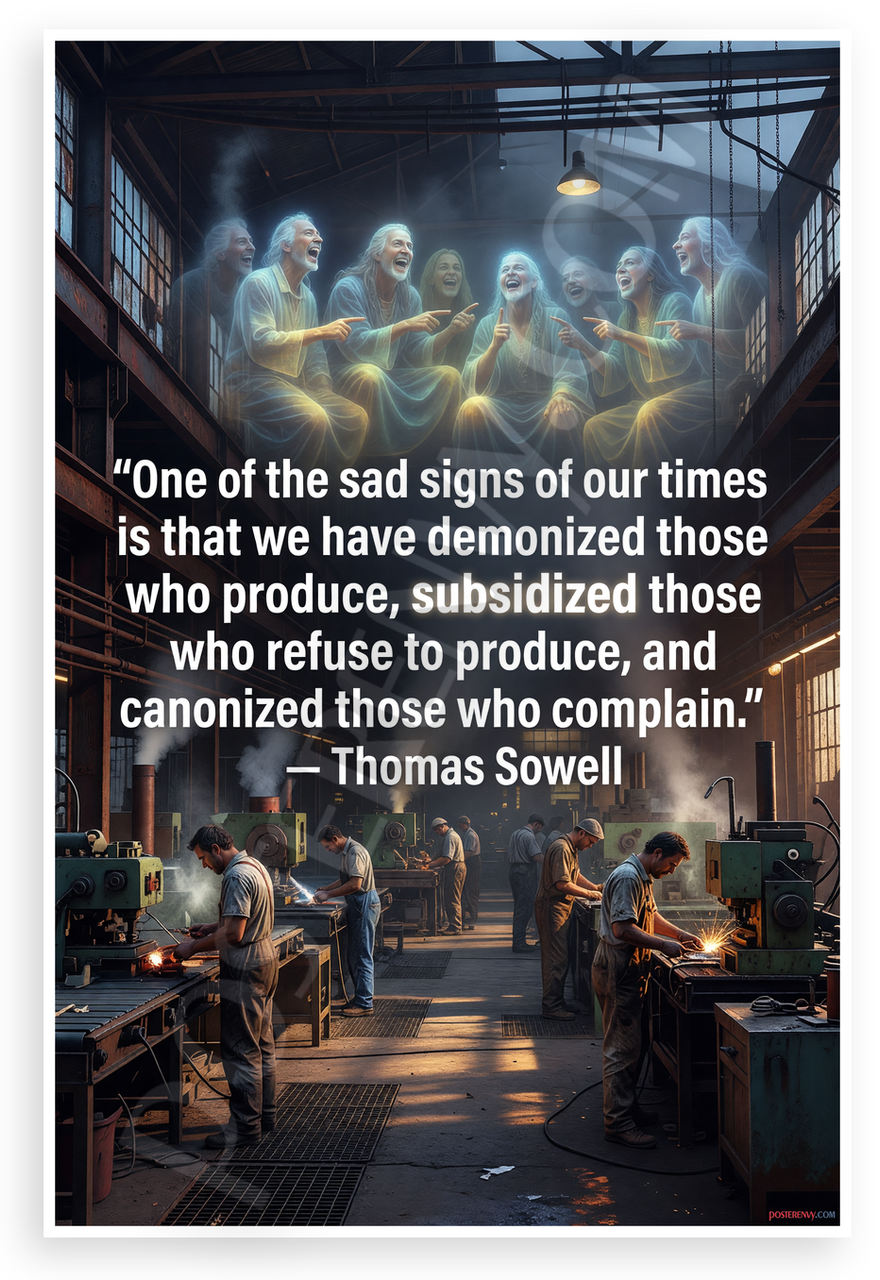 - Dramatic Industrial Scene: Moody dusk factory with toiling workers in foreground, ghostly laughing figures above, Thomas Sowell quote on demonizing producers. Creates thought-provoking atmosphere for office garage man cave workshop