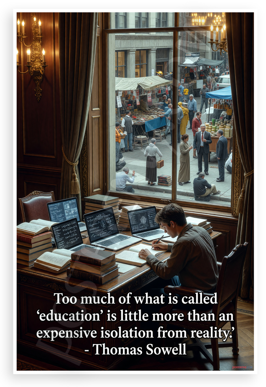 This 12x18 inch poster is printed on premium, durable paper. Proudly Made in the USA by PosterEnvy. The perfect size for any room. PosterEnvy is a family owned business, delivering top-notch posters around the world for over 20 years. Our posters are designed to last — they won't fade or pucker for years of enjoyment. Every poster features crisp, vivid artwork. We are a solar powered company. This striking poster depicts a focused student at a luxurious desk with books and laptops displaying equations, gazing out a window at a bustling street market scene symbolizing reality. It features the thought-provoking Thomas Sowell quote on education and isolation.