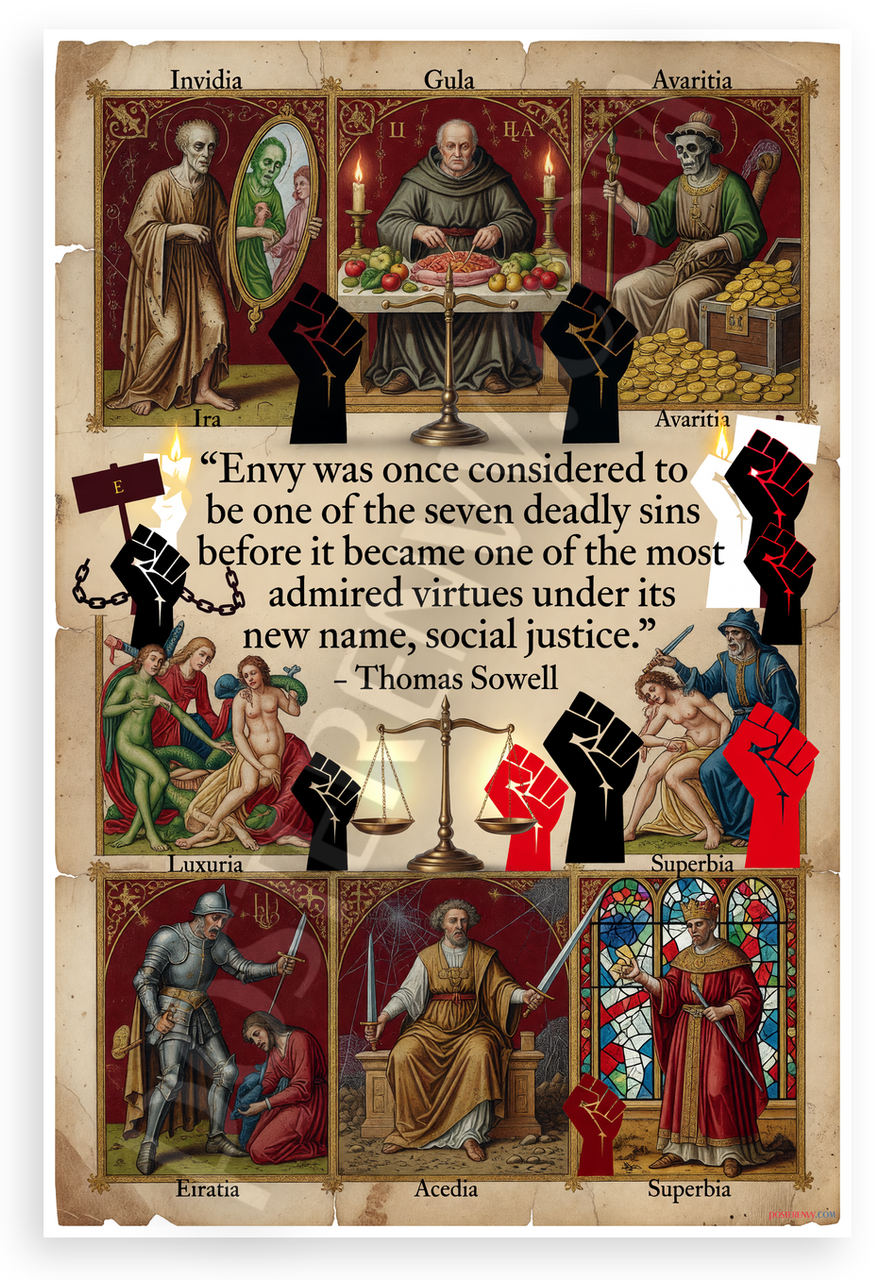 - Premium Print: This PosterEnvy 12x18 inch poster is printed on Durable, Heavy Duty Paper, Designed to last many years. Features Thomas Sowell quote on seven deadly sins and social justice with medieval art and raised fists.