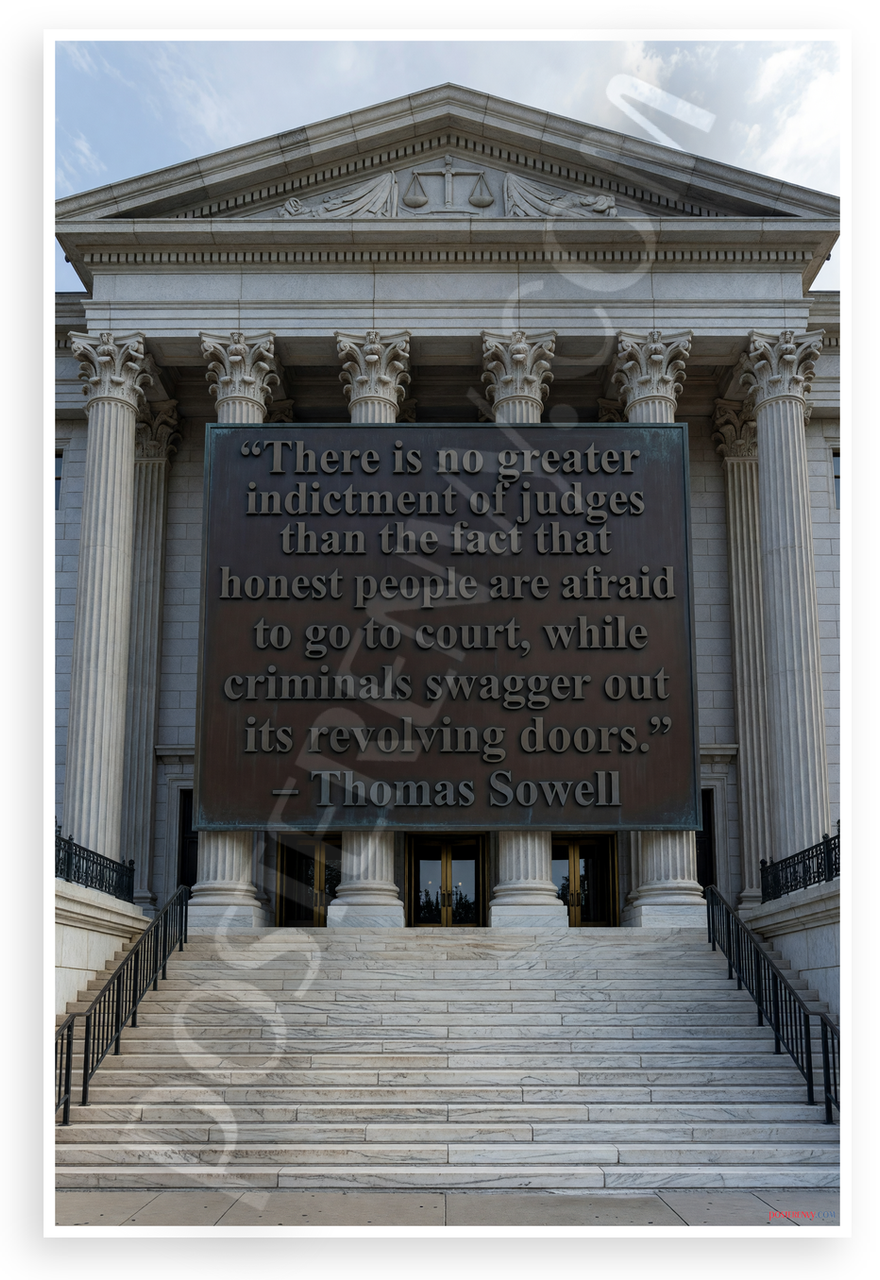 This 12x18 inch poster is printed on premium, durable paper. Proudly Made in the USA by PosterEnvy. The perfect size for any room. PosterEnvy is a family owned business, delivering top-notch posters around the world for over 20 years. Our posters are designed to last — they won't fade or pucker for years of enjoyment. Every poster features crisp, vivid artwork. We are a solar powered company. This striking poster depicts a majestic neoclassical courthouse with grand columns and scales of justice, overlaid with Thomas Sowell's powerful quote critiquing judicial integrity. Ideal for offices, studies, or law-related spaces.