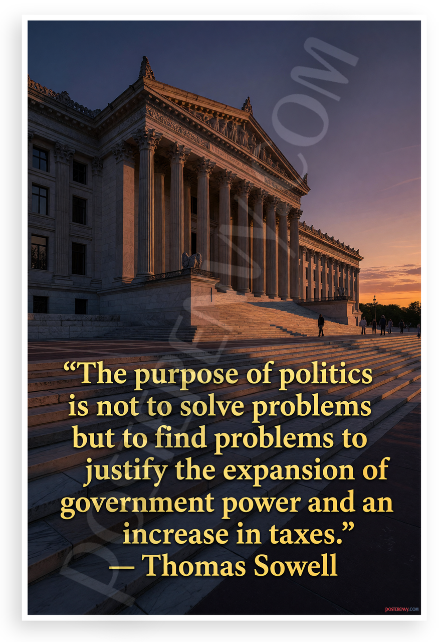 This 12x18 inch poster is printed on premium, durable paper. Proudly Made in the USA by PosterEnvy. The perfect size for any room. PosterEnvy is a family owned business, delivering top-notch posters around the world for over 20 years. Our posters are designed to last — they won't fade or pucker for years of enjoyment. Every poster features crisp, vivid artwork. We are a solar powered company. This striking poster showcases an imposing government building at dusk with lengthening shadows, overlaid with Thomas Sowell's provocative quote on politics, government expansion, and taxes in bold gold text, evoking a contemplative mood on authority and power.