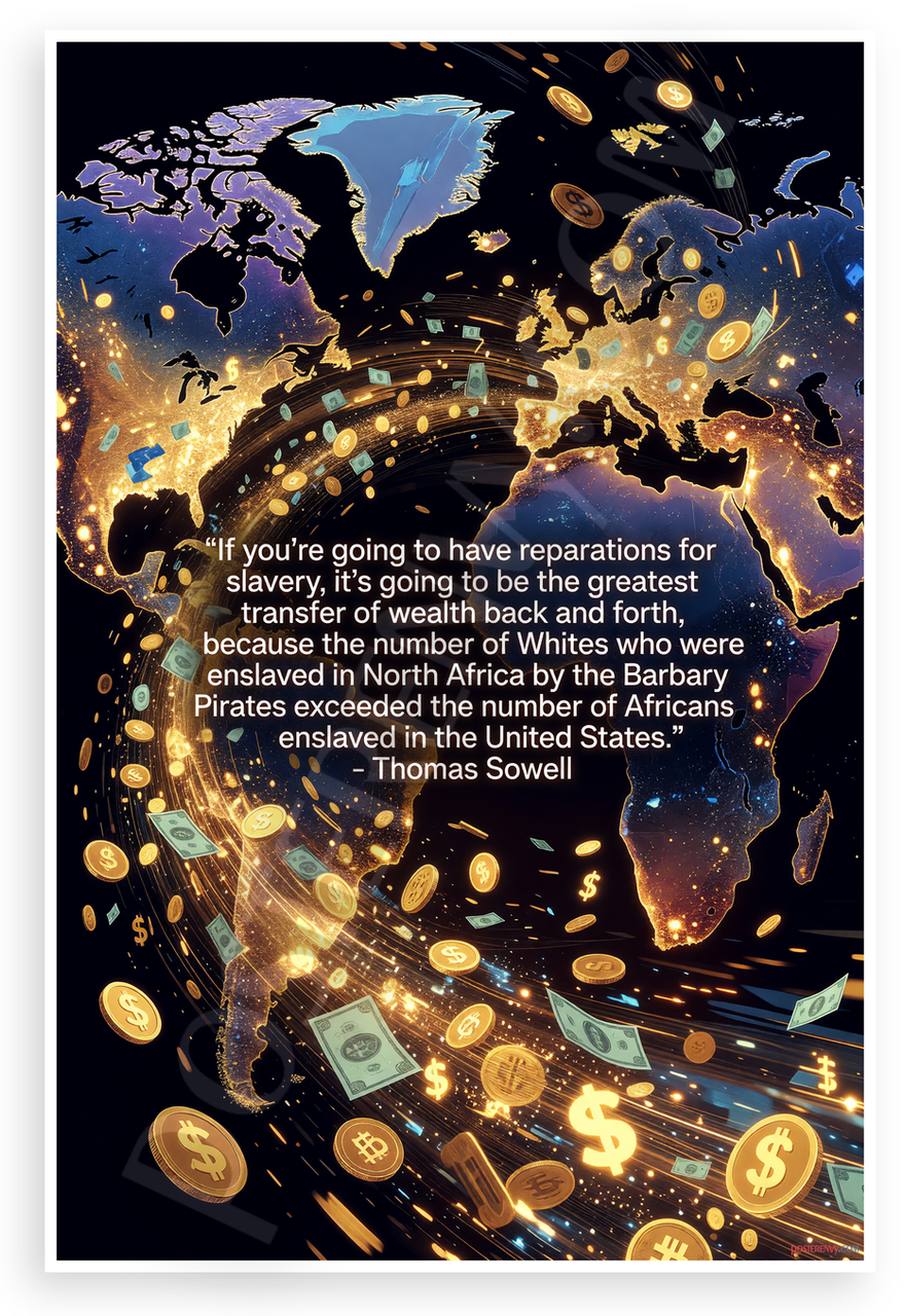 This 12x18 inch poster is printed on premium, durable paper. Proudly Made in the USA by PosterEnvy. The perfect size for any room. PosterEnvy is a family owned business, delivering top-notch posters around the world for over 20 years. Our posters are designed to last — they won't fade or pucker for years of enjoyment. Every poster features crisp, vivid artwork. We are a solar powered company. This provocative poster features a dynamic world map with glowing gold coins and currency swirling between continents, overlaid with economist Thomas Sowell's quote on reparations, slavery, and Barbary Pirates for a bold, energetic statement.