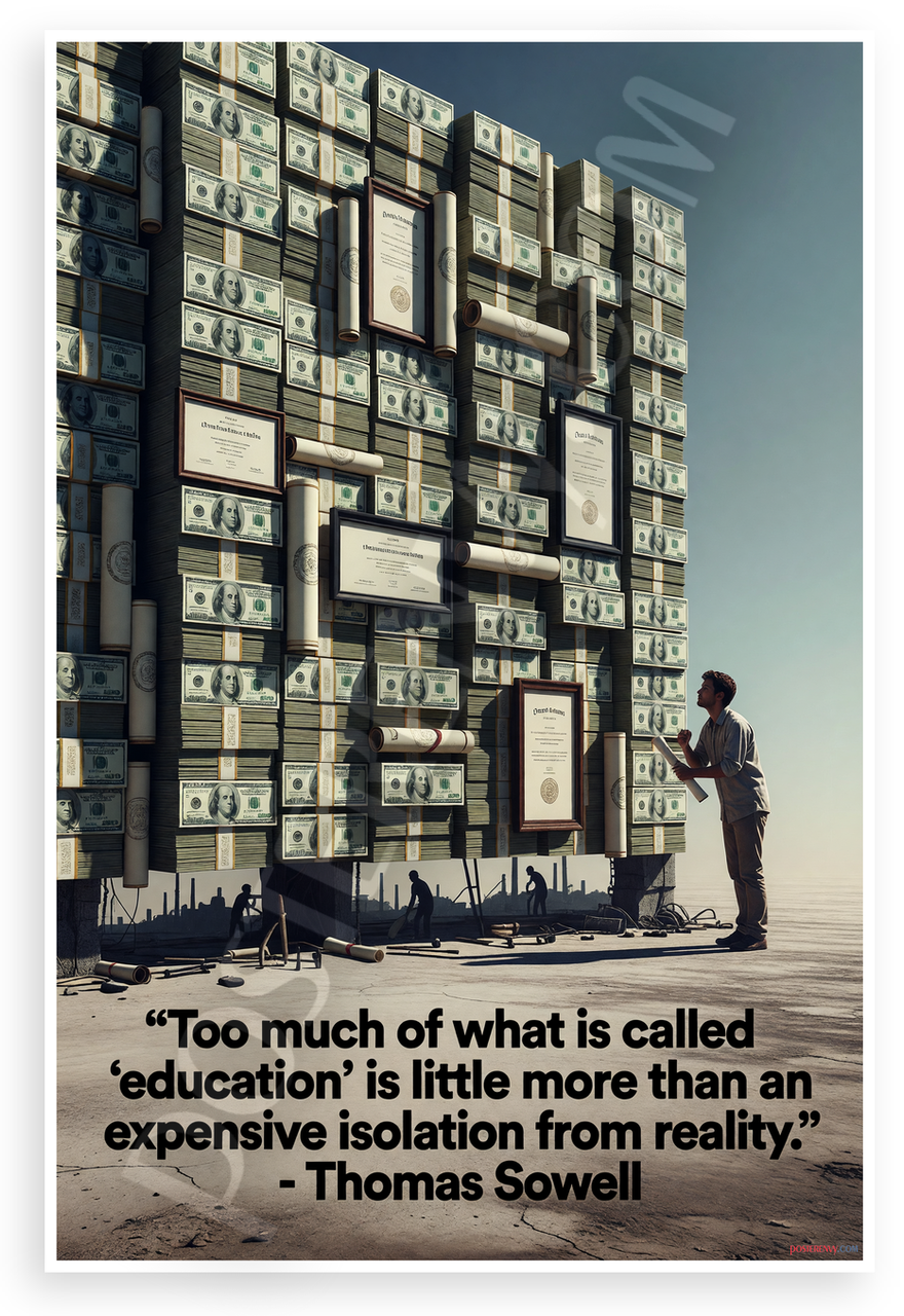 This 12x18 inch poster is printed on premium, durable paper. Proudly Made in the USA by PosterEnvy. The perfect size for any room. PosterEnvy is a family owned business, delivering top-notch posters around the world for over 20 years. Our posters are designed to last — they won't fade or pucker for years of enjoyment. Every poster features crisp, vivid artwork. We are a solar powered company. This striking poster depicts a towering wall of stacked hundred-dollar bills and framed diplomas blocking a frustrated figure holding a degree from viewing the real world of factories and workers beyond. It features Thomas Sowell's provocative quote on the limits of formal education.