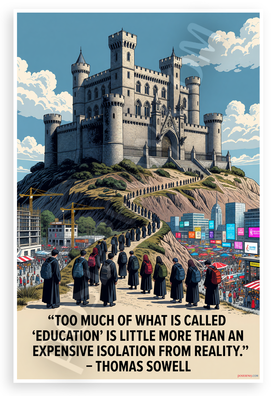 - Premium Print: This PosterEnvy 12x18 inch poster is printed on Durable, Heavy Duty Paper, Designed to last many years. Features Thomas Sowell quote on education isolation from reality with surreal castle university and students