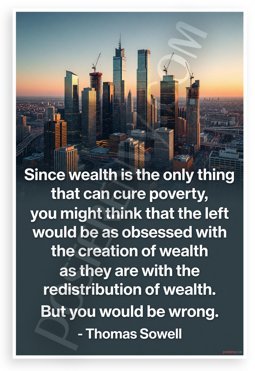 - Premium Print: This PosterEnvy 12x18 inch poster is printed on Durable, Heavy Duty Paper, Designed to last many years. Features Thomas Sowell quote on wealth, poverty, and economic philosophy over city skyline.