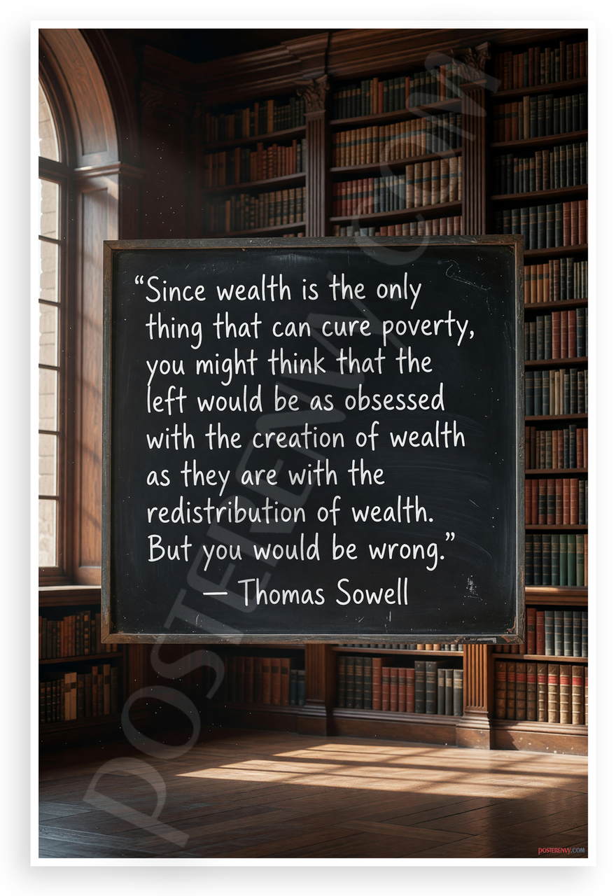 - Premium Print: This PosterEnvy 12x18 inch poster is printed on Durable, Heavy Duty Paper, Designed to last many years. Features Thomas Sowell quote on wealth, poverty, and redistribution in library scene