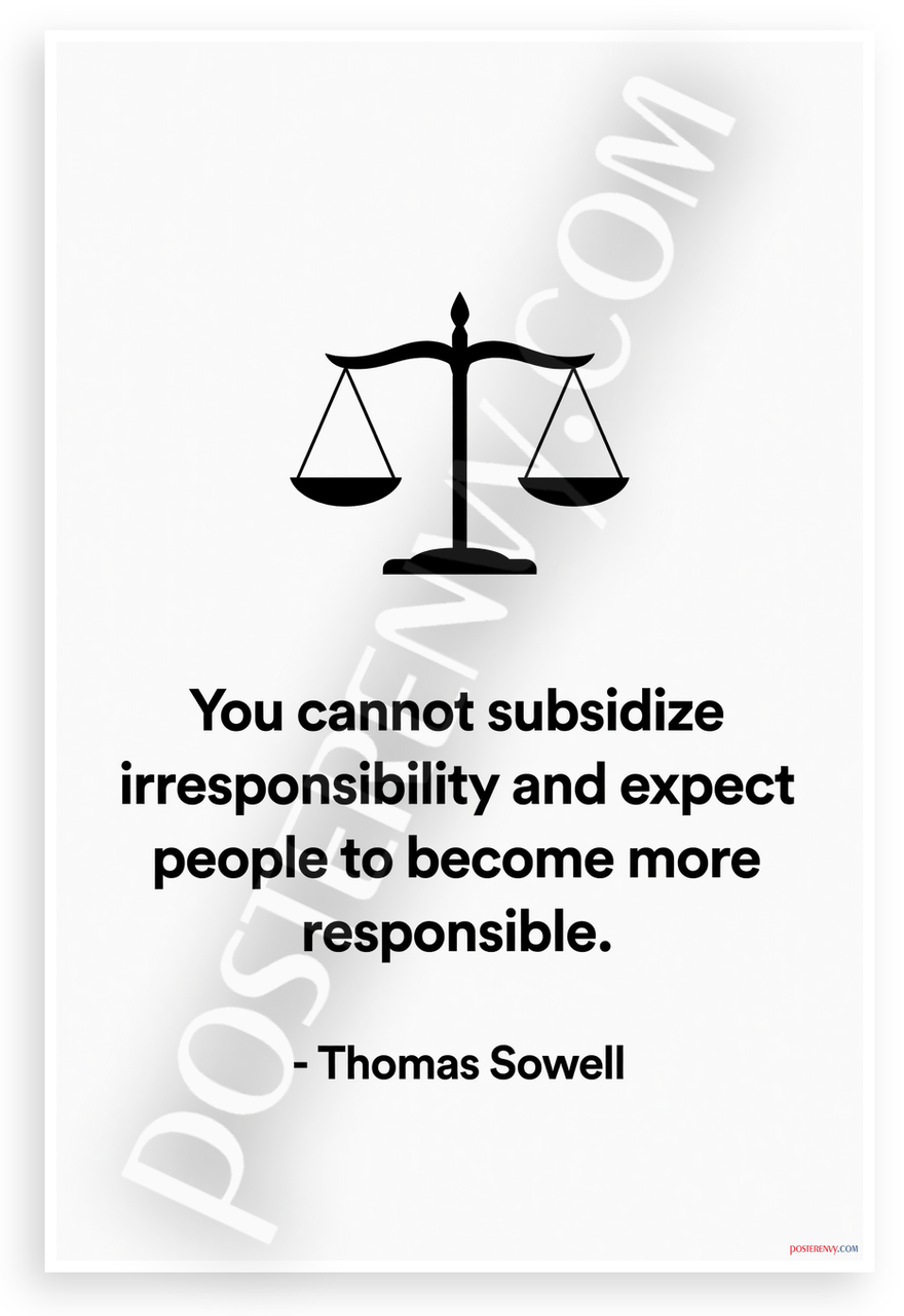 - Bold Minimalist Design: Stark black scale of justice atop clean white background with Sowell's quote on subsidies and responsibility evokes serious reflection. Perfect for office, study, or library walls.